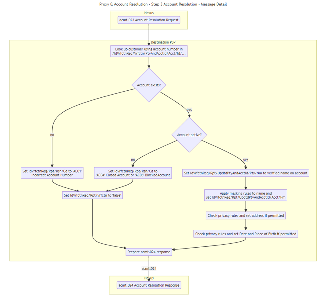 Nexus will forward the `acmt.024` response (from the Destination PSP) to the Source PSP, via the IPS. See [**Step 4**](https://docs.nexusglobalpayments.org/addressing-and-proxy-resolution/proxy-and-account-resolution-process/step-4-source-psp-processes-the-results).